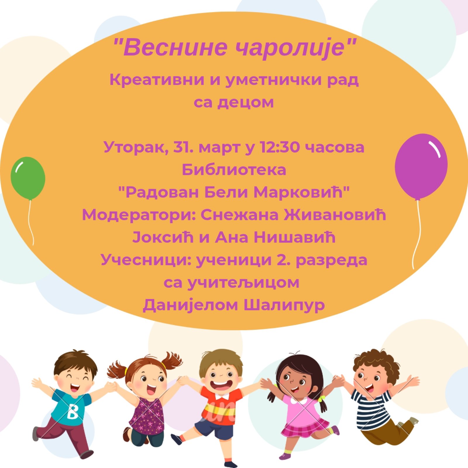 У уторак, 31. марта 2026. године, са почетком у 12.30 часова, Библиотека организује програм под називом „Веснине чаролије“ у знак сећања на драгу колегиницу Весну Вујичић, која је својом изразитом креативношћу и посвећеним радом са децом, оставила блистав траг у сваком кутку библиотеке. Програм ће бити креативног и уметничког садржаја, а своја умећа показаће ученици 2. разреда, са учитељицом Данијелом Шалипур.