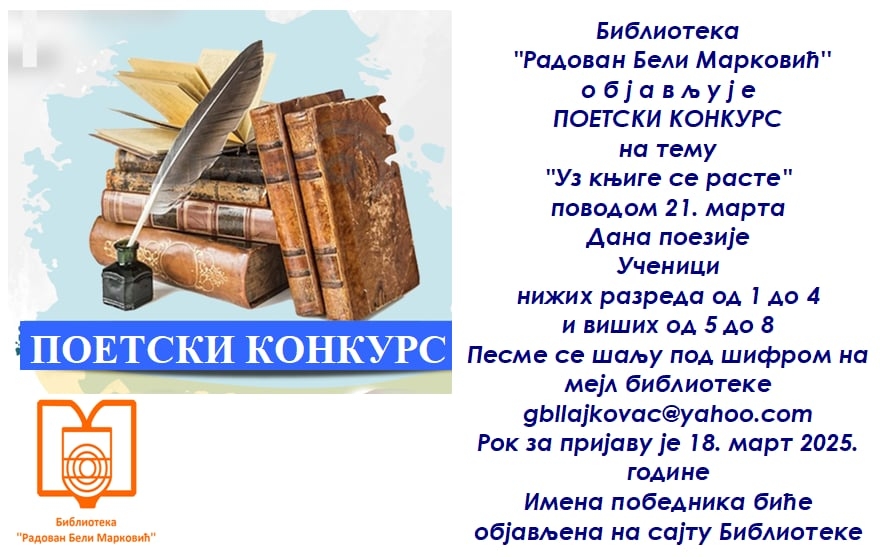 Библиотека „Радован Бели Марковић“ расписује поетски конкурс за основце у сусрет Светском дану поезије који се обележава 21. марта