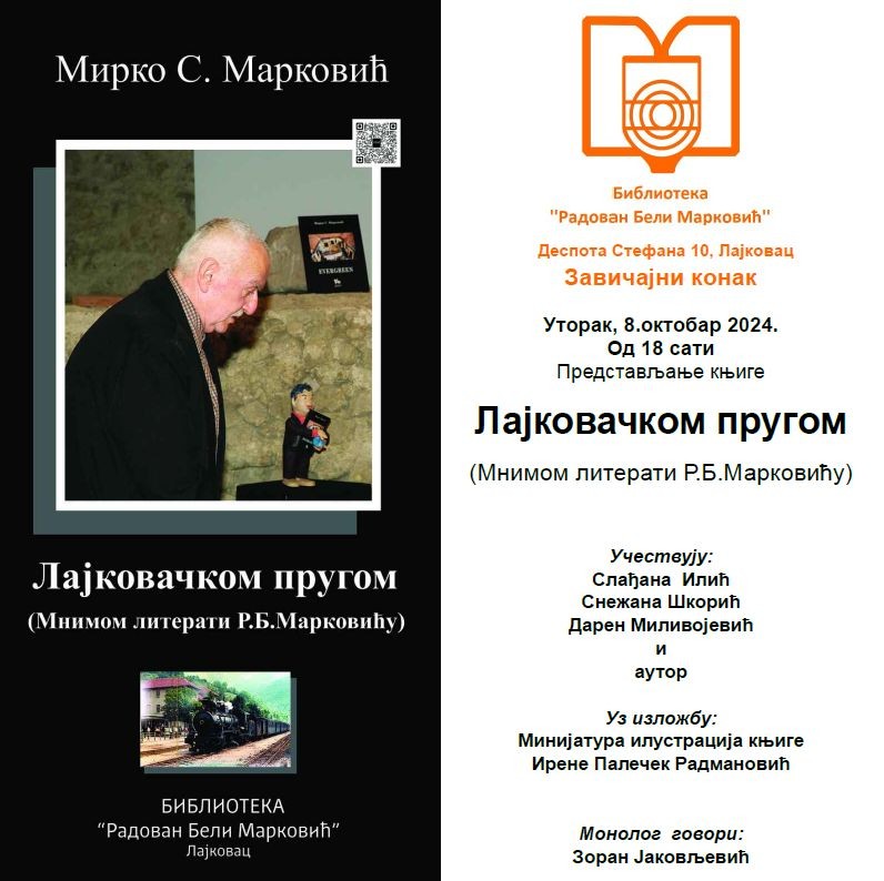 У Завичајном конаку Библиотеке “ Радован Бели Маркивић“ биће одржано представљање књиге “ Лајковачком пругом“ аутора Мирка С. Марковића у уторак, 08. октобра 2024. године у 18 часова.