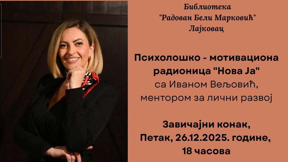 дец192025Психолошка - мотивациона радионица ``Нова Ја``Пријава путем телефона 014/3433155. Радионица је бесплатна. Број учесника је ограничен.